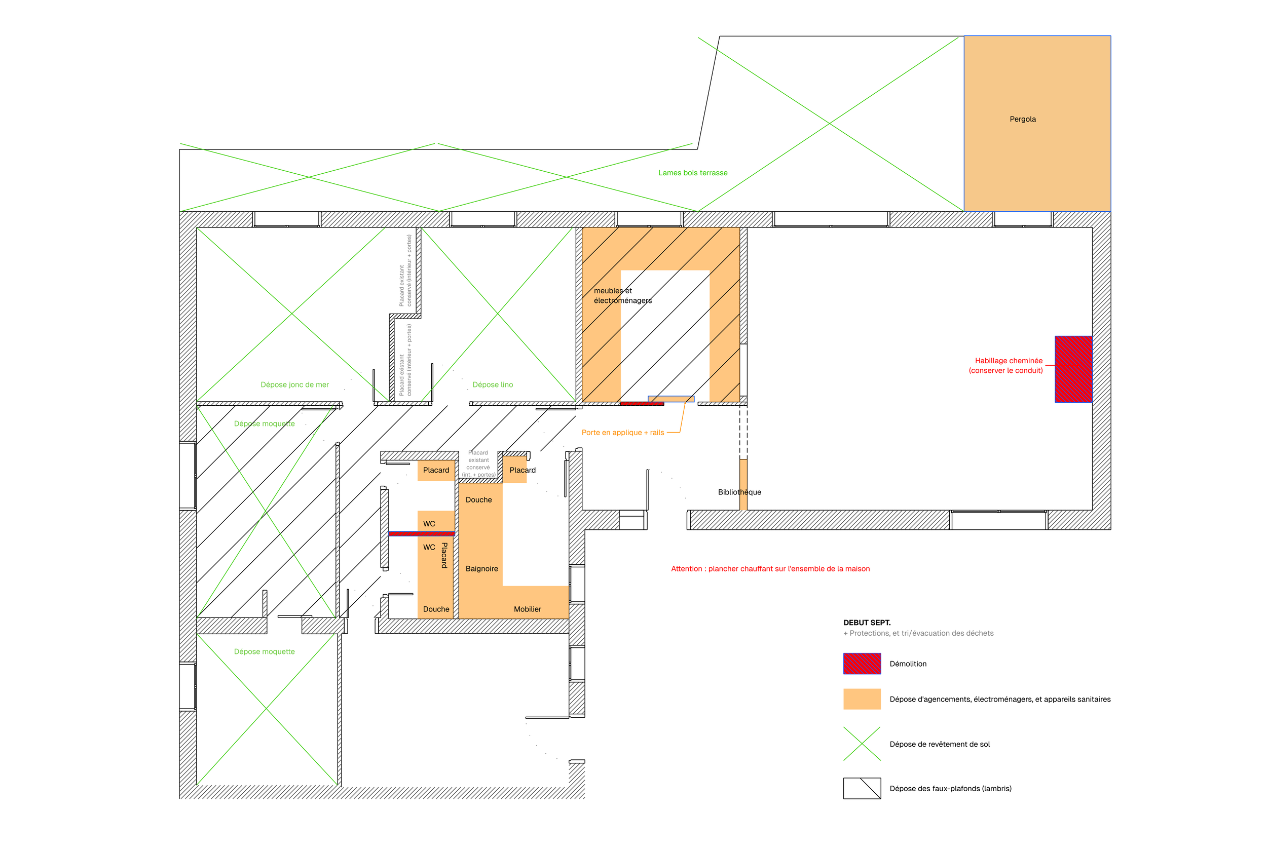 Rénovation de tout l’intérieur (salles d’eau, cuisine, séjour, entrée, revêtements de sol et de mur, certains faux-plafonds, plomberie, cheminée gaz,…)