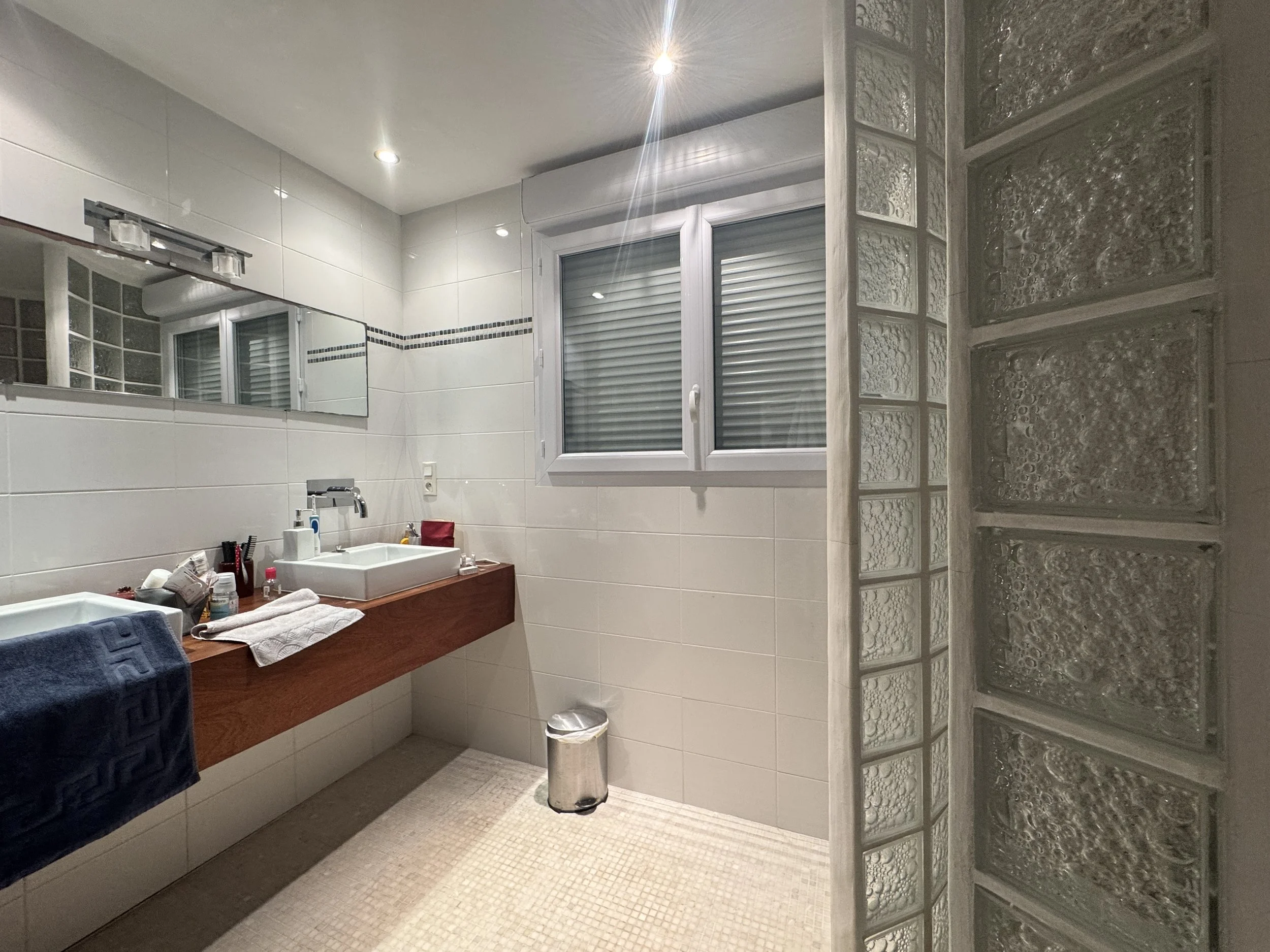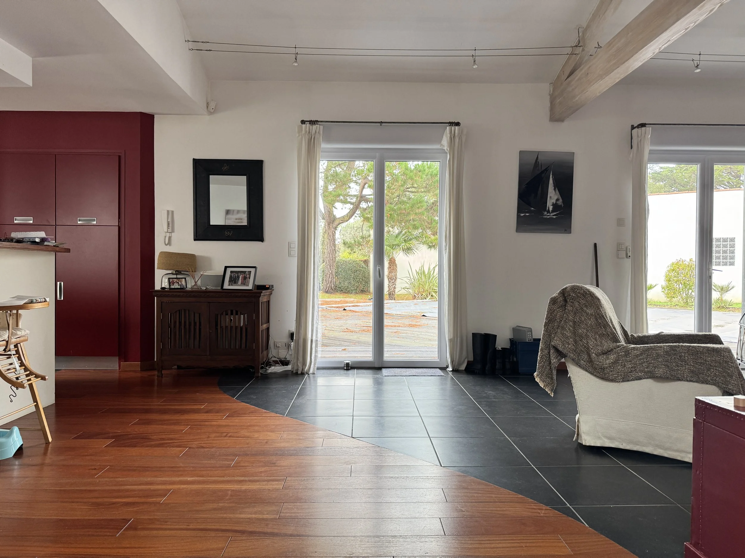Dans cette grande maison située en bord de mer, la cliente a choisi de constituer une équipe à deux voix : un architecte pour l’extension et la réfection complète des extérieurs (piscine, jardins, locaux techniques…) et moi-même pour la conception des intérieurs. L’objectif : profiter du chantier de l’extension pour repenser les espaces existants, leur circulation, leurs rangements, et surtout leur style.
