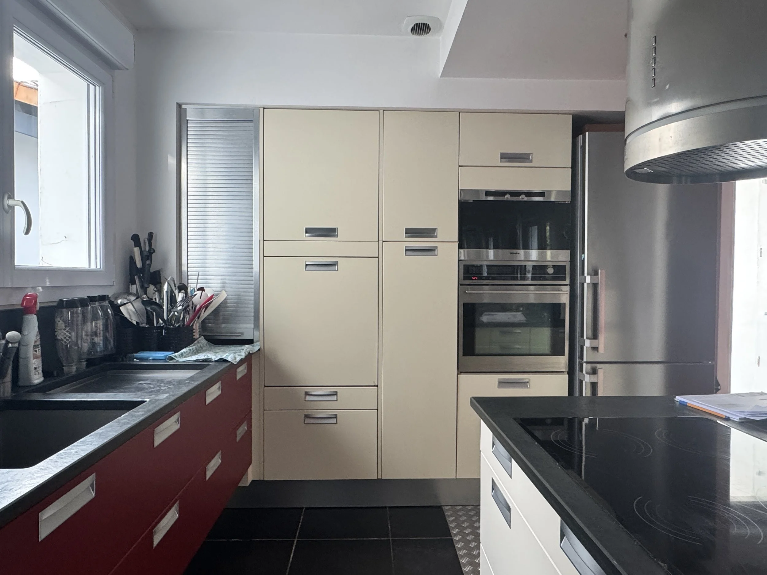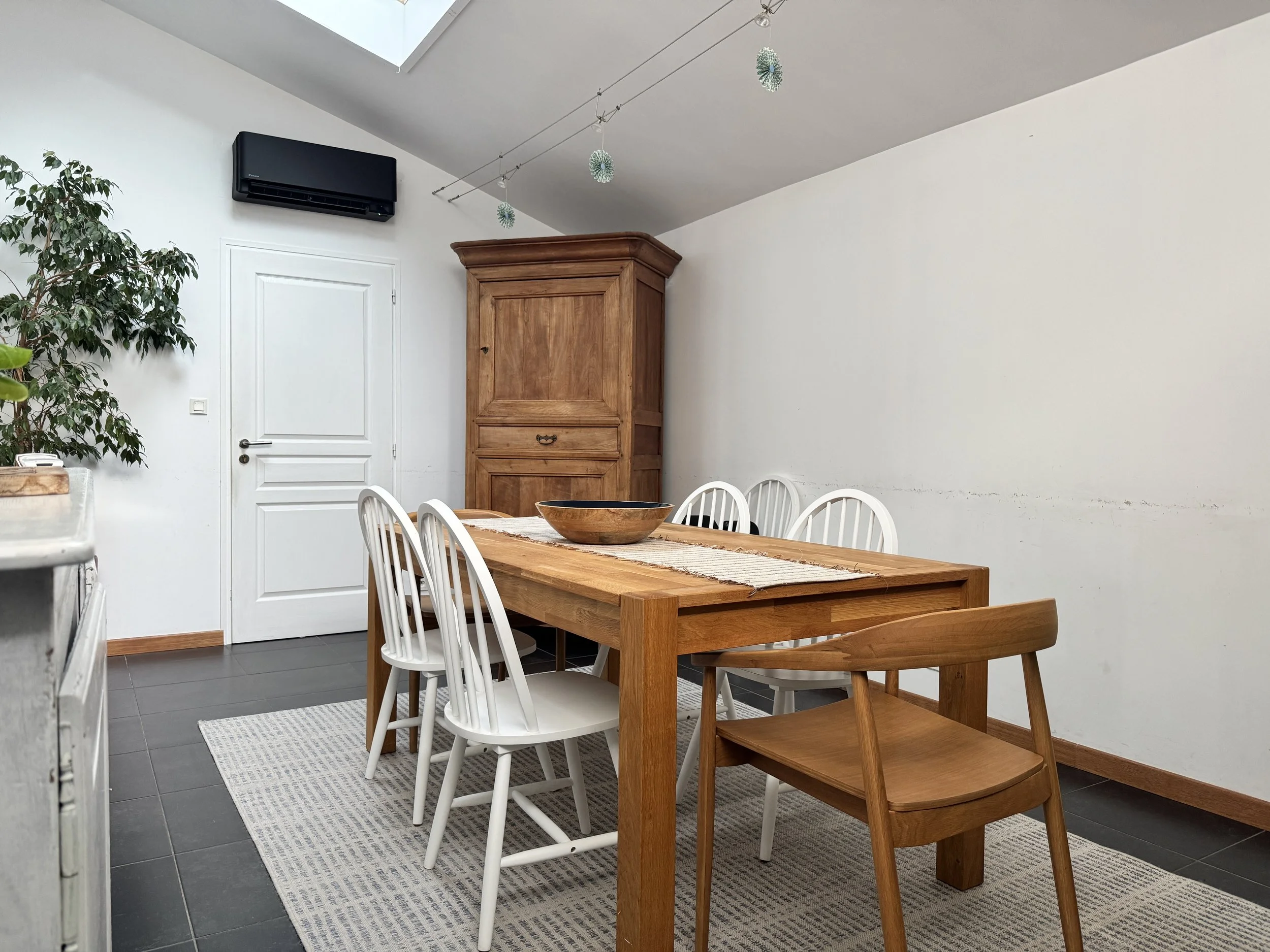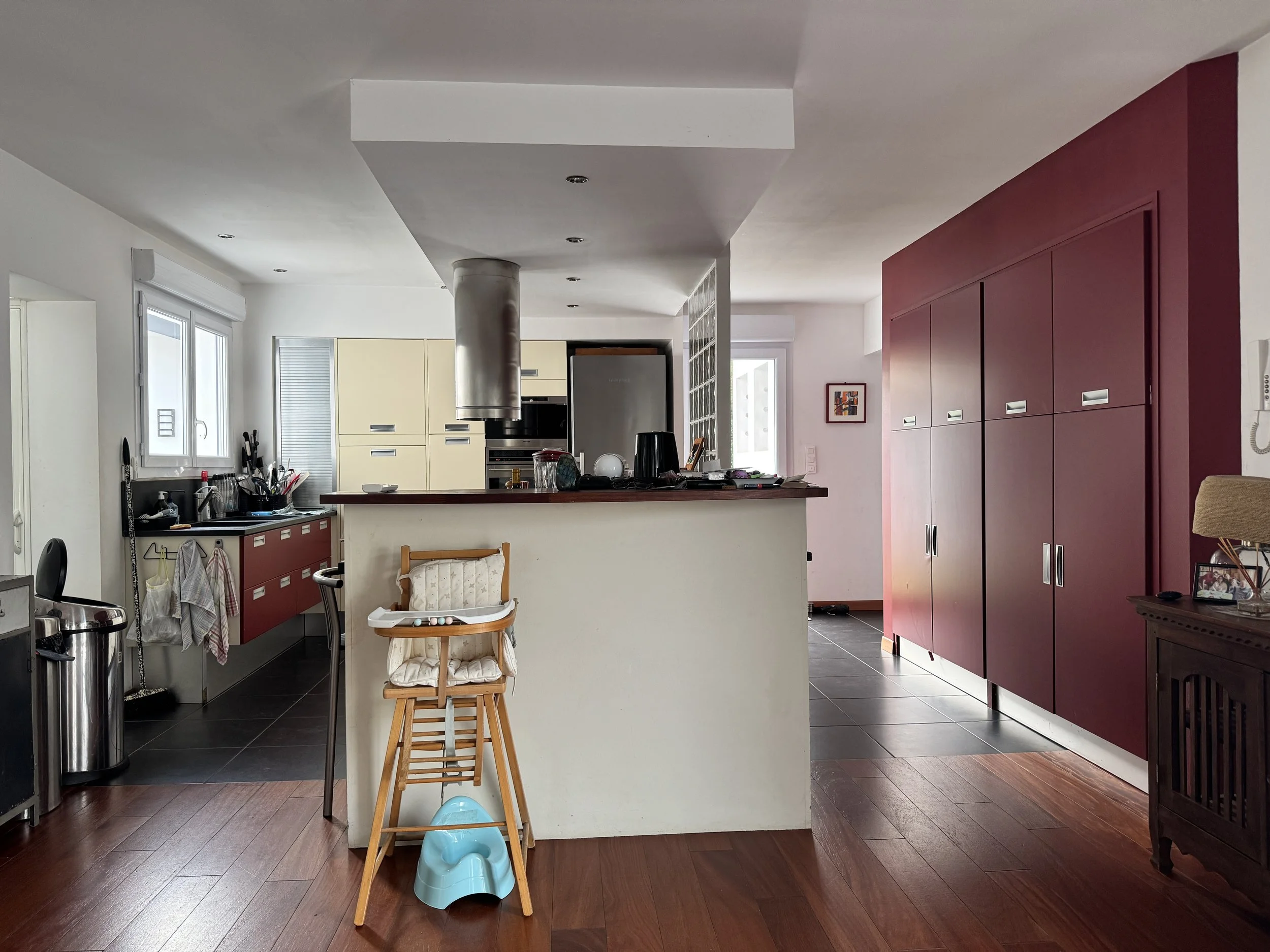 La première phase a consisté à débroussailler tous les besoins et envies, afin de définir un aménagement global cohérent, à la fois pour les espaces existants et pour les volumes nouvellement créés. Nous avons posé les bases d’un style intemporel de maison de famille, en intégrant certaines matières du lieu qui seront réemployées — notamment l’ardoise de France des plans de travail de la cuisine.